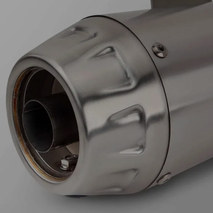 Pro-Race silencers design comes from the first prototypes made for. Pro-Race silencers are built putting together a conical-shaped part (the main body of the silencer) with a cylindrical ending section (ø98mm) and these are available in titanium or nichrom (a stainless steel alloy).