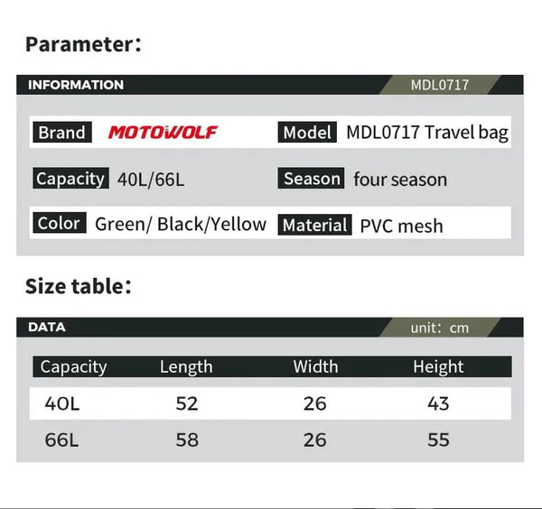 MOTOWOLF | Motorcycle Tail Bag - 40L Waterproof | Duffel Bag for Touring Adventure, Camping, Cycling
